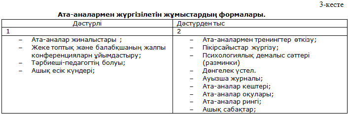 - а) Ата-аналармен педагогикалық, психолоиялық біллімдерін көтеру; (Дәрістер оқу, семинарлар ұйымдастрыу, жеке және топтық кеңестер, тәжірибелік жұмыстар, т.б.);